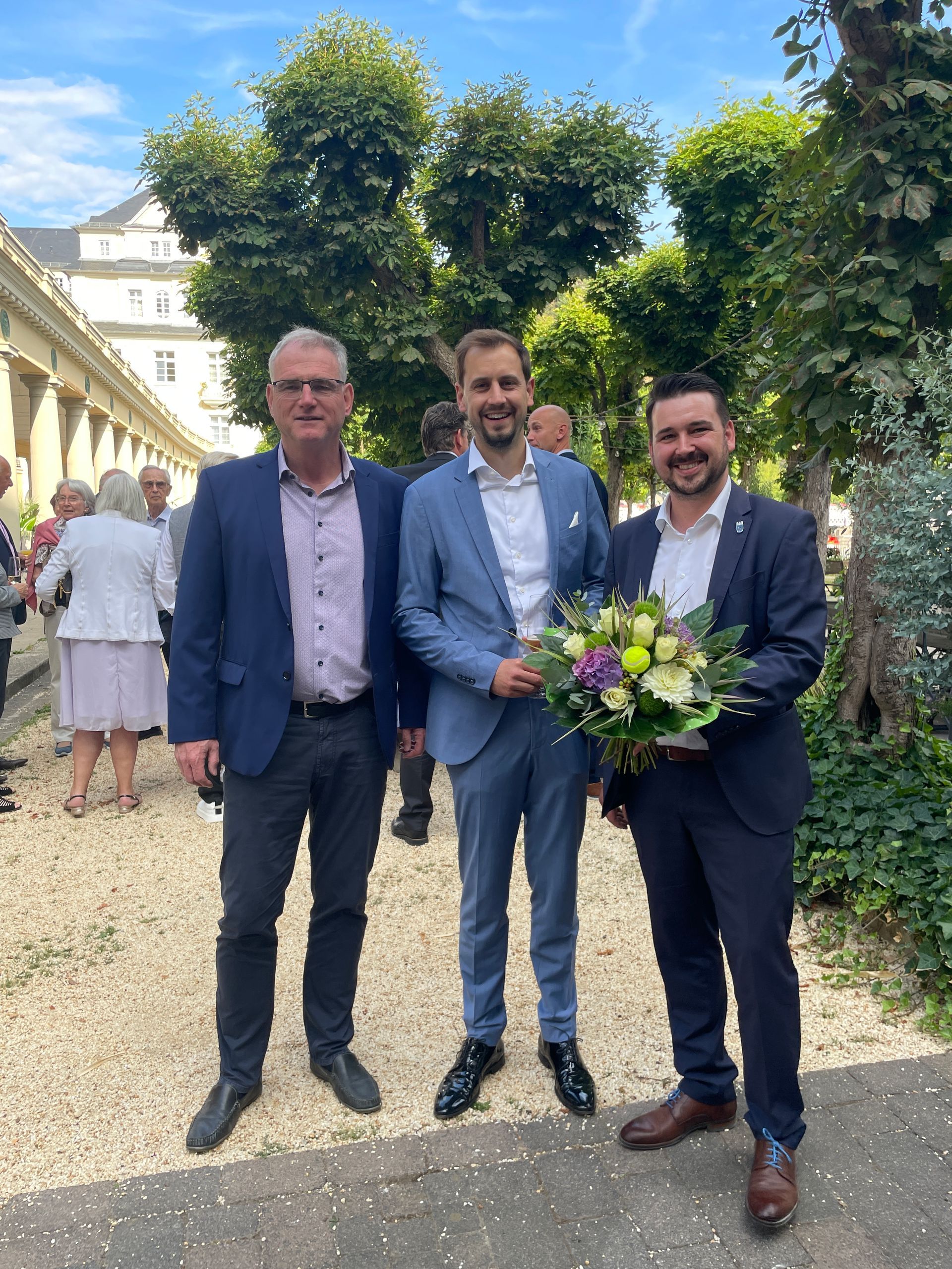 VG-Bürgermeister Uwe Bruchhäuser, Vorsitzender Benjamin Löwenstein und Stadtbürgermeister Oliver Krügel mit Blumengruß für den Tennisclub, Foto: Mike Hewel