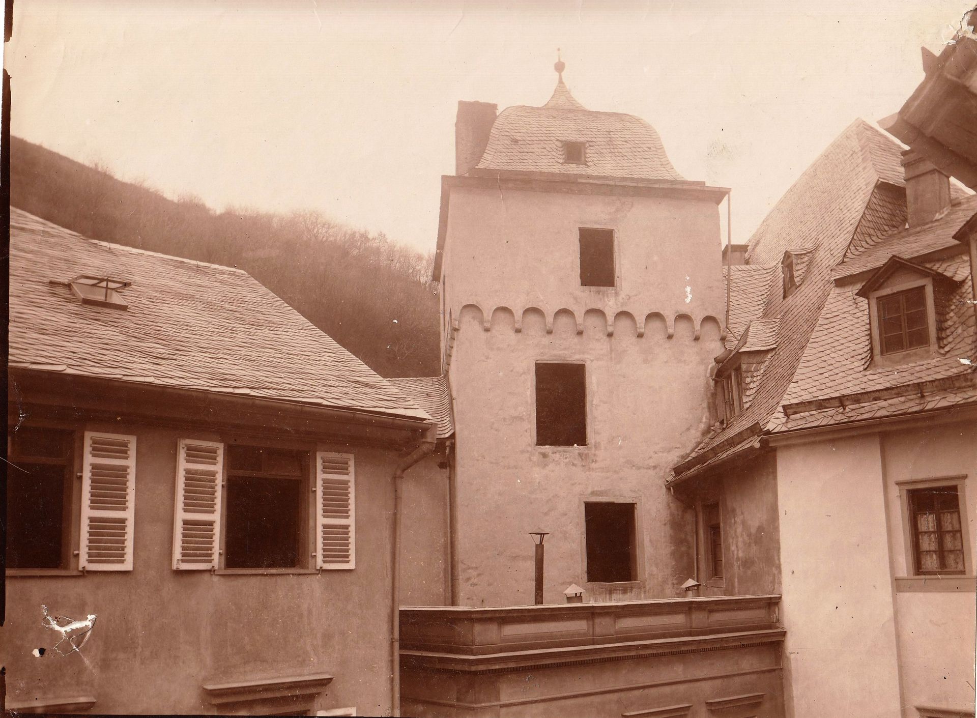 Der im 14. oder 15. Jahrhundert erbaute Turm an den Bädern beim heutigen Kränchen-Brunnen, aufgenommen kurz vor dem Abbruch im Jahr 1900. Stadtarchiv Bad Ems