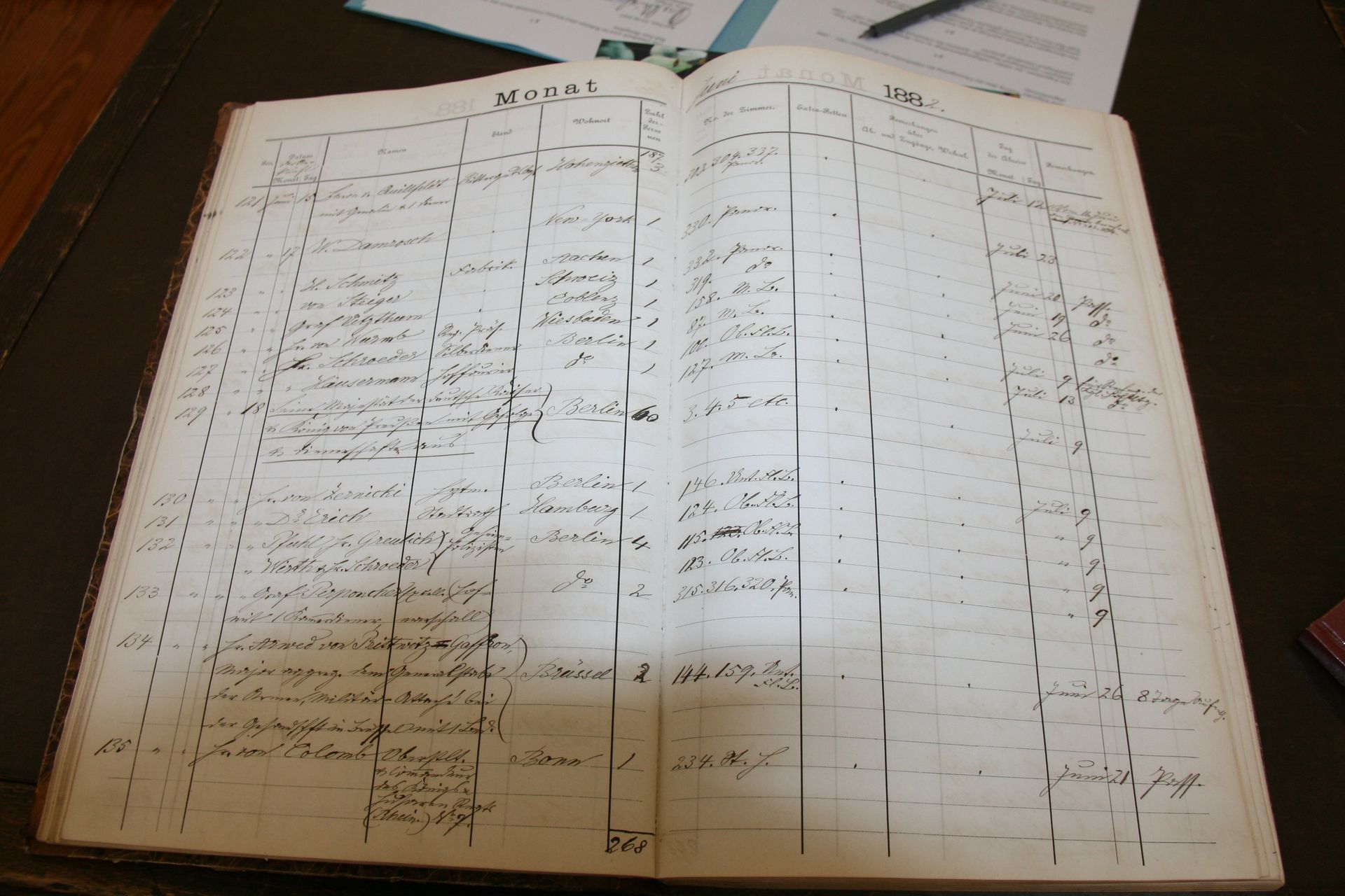 Schütze bezeichnete das Gästebuch als einen „Schatz“. Allein schon optisch ist es ein Hingucker. In fein geschwungener Kurrentschrift, mit Gallustinte und Feder geschrieben, gibt es detailliert Auskunft über Titel, Namen und Herkunft der Gäste, mit wieviel Personen sie anreisten, welche Zimmer sie bewohnten, ob es Extrabetten oder andere Besonderheiten gab.