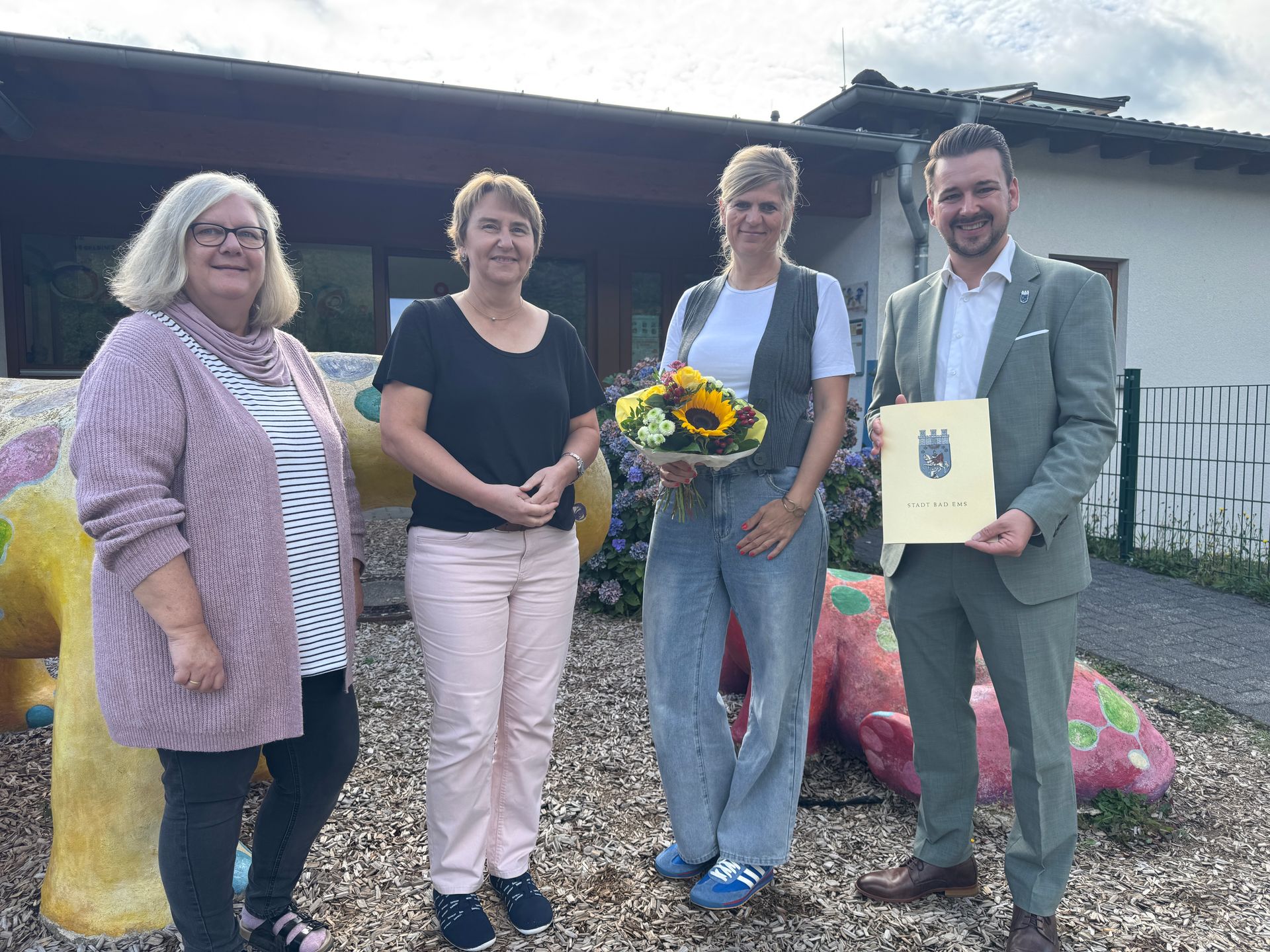 Bad Ems/Kita Eisenbach, September 2025 – In der Kindertagesstätte Eisenbach wurde ein ganz besonderes Jubiläum gefeiert: Frau Carolin Mielke blickt auf 25 Jahre im Dienst als Erzieherin in der Kita Eisenbach zurück. Tatsächlich ist Frau Mielke bereits seit 1999 mit der Einrichtung eng verbunden: Damals absolvierte sie ihr Vorpraktikum in Eisenbach, bevor sie in die Ausbildung zur Erzieherin eintrat. Seitdem ist sie durchgehend für die Kindertagesstätte tätig und damit mittlerweile im 26. Jahr Teil des Teams. In dieser langen Zeit hat Frau Mielke in unterschiedlichsten Funktionen gewirkt. Unter anderem war sie einige Jahre die direkte Stellvertreterin der Einrichtungsleitung. Kita-Leiterin Claudia Bruchhäuser würdigte in diesem Zusammenhang die stets vertrauensvolle, konstruktive und verlässliche Zusammenarbeit mit Frau Mielke, die wesentlich zur positiven Entwicklung der Einrichtung beigetragen habe. Auch Stadtbürgermeister Oliver Krügel hob die Bedeutung des Engagements hervor: „25 Jahre in einer Kindertagesstätte bedeuten 25 Jahre voller Herzblut, Geduld und Verantwortung für die jüngsten Mitglieder unserer Gesellschaft. Frau Mielke hat mit ihrer Arbeit Generationen von Kindern geprägt und ist zugleich eine wichtige Stütze für die Eltern, das Team und die Leitung der Einrichtung. Dafür sprechen wir ihr unseren herzlichen Dank und unsere Anerkennung aus.“ Die Stadt Bad Ems gratuliert Frau Carolin Mielke herzlich zu diesem besonderen Jubiläum und freut sich auf viele weitere gemeinsame Jahre der erfolgreichen Zusammenarbeit.