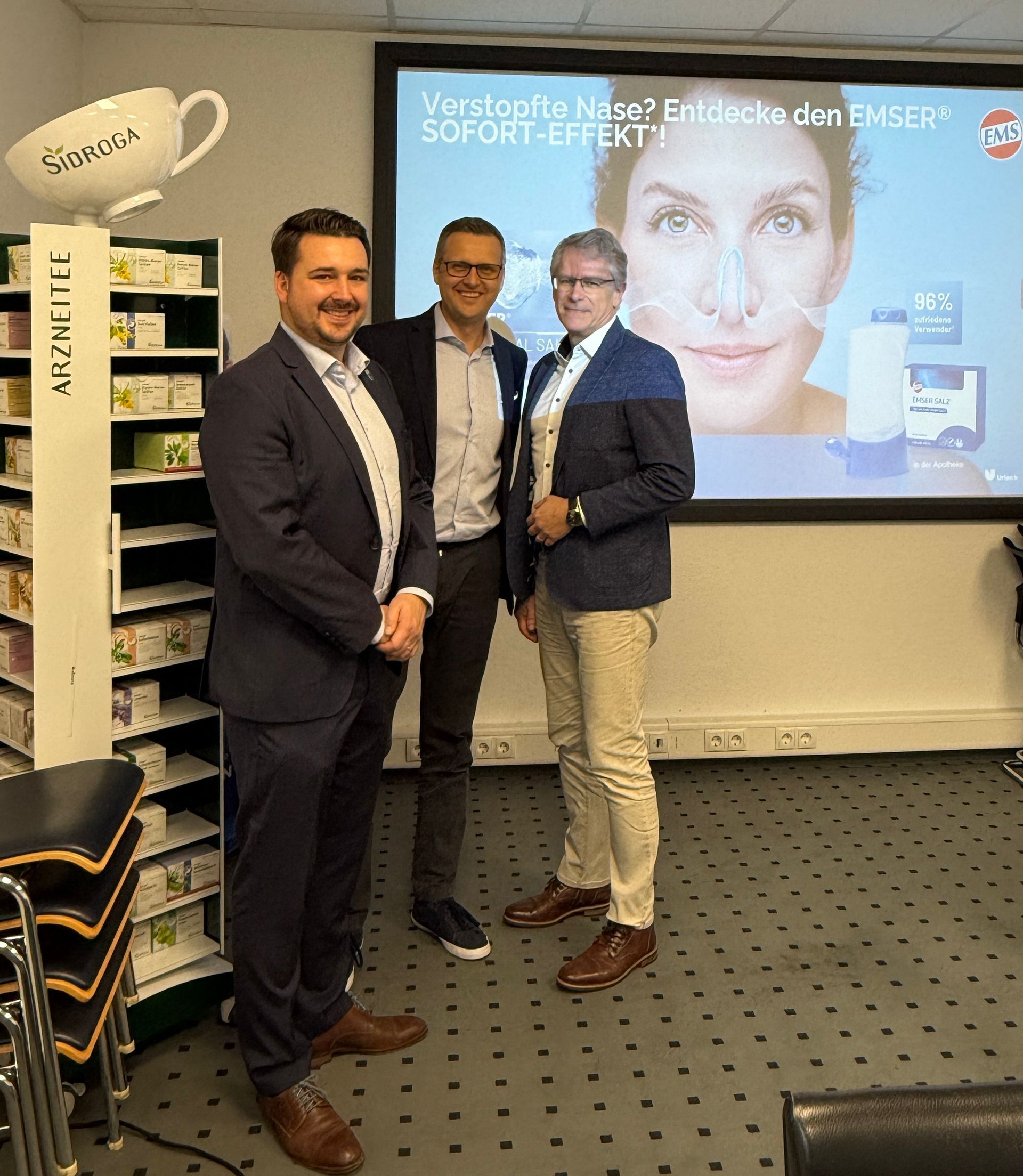 Bildunterzeile: Staatsbad Geschäftsführer Achim Deusner (rechts) und Stadtbürgermeister Oliver Krügel (links) im Gespräch mit URIACH CEO Sebastian Werner