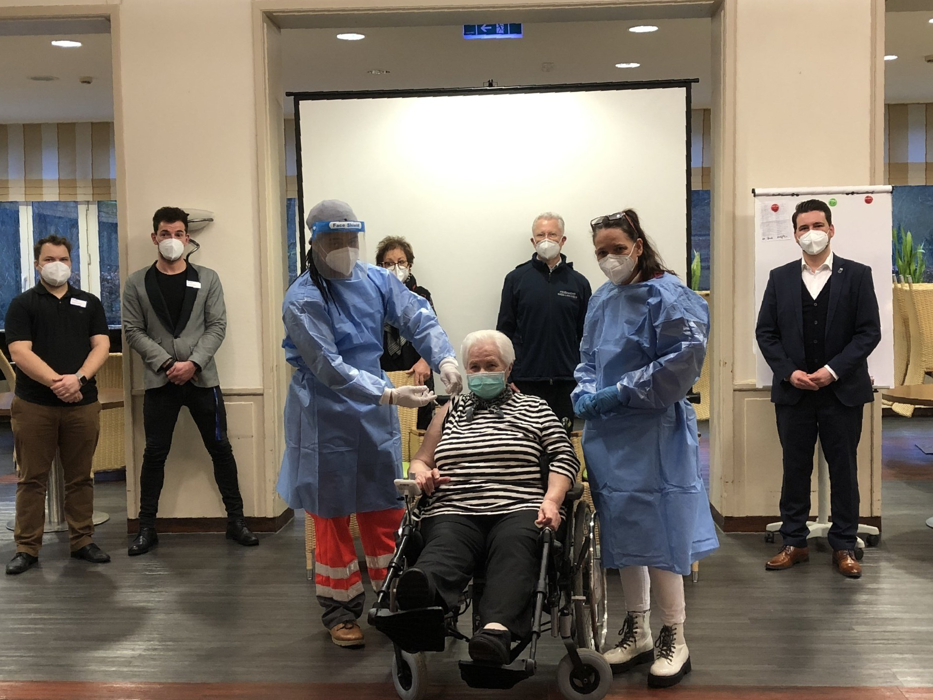 Bei der ersten Corona-Impfung im Stadtgebiet waren - unter verschärften Hygiene- und Zutrittsbedingungen - unter anderem der Landrat des Rhein-Lahn-Kreises Frank Puchtler, die Erste Beigeordnete des Rhein-Lahn-Kreises sowie der Verbandsgemeinde Bad Ems - Nassau Gisela Bertram und der Bürgermeister der Stadt Bad Ems Oliver Krügel vertreten.