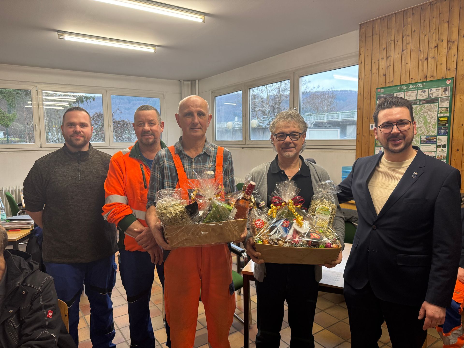 Foto / Bauhof Bad Ems: Stv. Bauhofleiter Max Fischer (v.l.), Bauhofleiter Rolf Daniel und Stadtbürgermeister Oliver Krügel (rechts im Bild) verabschieden Werner Breuer (3 v.l.) und Frank Lanio mit einem Präsentkorb als Anerkennung für die langjährige Treue Zum Jahreswechsel wurden mit Werner Breuer und Frank Lanio zwei langjährige und hochgeschätzte Mitarbeiter des städtischen Bauhofs in den wohlverdienten Ruhestand verabschiedet. Frank Lanio, der seit dem 1. Januar 2009 im Bauhof tätig war, verantwortete insbesondere Elektroarbeiten, die Stadtreinigung sowie die Instandhaltung der städtischen Ausstattung. Werner Breuer, der dem Bauhof bereits seit dem 18. März 1985 angehörte, war vor allem für Verkehrssicherung, Beschilderung und Straßenreparaturen zuständig. Mit ihrem Ausscheiden endet nicht nur eine berufliche Wegstrecke, sondern es geht zugleich ein bedeutendes Stück Erfahrung, Fachwissen sowie gelebter Bauhofpraxis verloren. Beide galten über viele Jahre hinweg als echte Leistungsträger. Ihr Wissen, das sich aus Fachkenntnis, Erfahrung und zahlreichen besonderen Situationen des Arbeitslebens speiste, lässt sich nicht vollständig weitergeben. Vieles davon entsteht nur durch langjährige Praxis – durch Erlebtes, durch bewältigte Herausforderungen und durch das Wissen, wie man in wiederkehrenden oder auch außergewöhnlichen Fällen richtig reagiert. Diese Lücke wird die Mannschaft nun gemeinsam schließen müssen, insbesondere mit Blick auf die jüngeren Nachfolgerinnen und Nachfolger. Neben der fachlichen Seite wiegt jedoch auch der menschliche Abschied schwer. Mit Werner Breuer und Frank Lanio verlassen nicht nur Kollegen, sondern auch Freunde das Team. Der Abschied erfolgt daher durchaus mit einem weinenden Auge. Gleichzeitig überwiegt die Freude darüber, dass beide bei bester Gesundheit in einen neuen Lebensabschnitt starten können – etwas, das keineswegs selbstverständlich ist. „Wir verlieren zwei Persönlichkeiten, die unsere Arbeit über viele Jahre geprägt haben – fachlich wie menschlich“, betonte Stadtbürgermeister Oliver Krügel im Rahmen der Verabschiedung und führte weiter aus: „Gleichzeitig dürfen wir dankbar sein, dass beide nun gesund und mit vielen Möglichkeiten vor sich in diese neue Phase starten.“ Auch Bauhofleiter Rolf Daniel richtete im Namen der gesamten Mannschaft Worte des Dankes an die beiden Ruheständler. „Werner Breuer und Frank Lanio waren über viele Jahre feste Größen in unserem Bauhof. Auf ihre Erfahrung, ihre Verlässlichkeit und ihre Kollegialität war jederzeit Verlass“, so Daniel. Beide hätten den Bauhof nicht nur fachlich geprägt, sondern auch menschlich das Miteinander entscheidend mitgestaltet. Dass der Ruhestand für Werner Breuer und Frank Lanio eher ein „Unruhestand“ werden dürfte, daran zweifelt niemand, der beide kennt. Zu aktiv, zu interessiert und zu engagiert sind ihre Persönlichkeiten, um sich dauerhaft zurückzulehnen. Zum Abschluss betonte Oliver Krügel, dass mit dem Eintritt in den Ruhestand zwar ein Kapitel ende, die Verbundenheit jedoch bleibe: Mit großem Dank, Respekt und den besten Wünschen für Gesundheit, Zufriedenheit und neue Aufgaben verabschiedet sich die Stadt von zwei geschätzten Kollegen – verbunden mit der Hoffnung, dass der Kontakt auch über den aktiven Dienst hinaus erhalten bleibt. Pressemitteilung der Stadt Bad Ems vom 05.01.2026