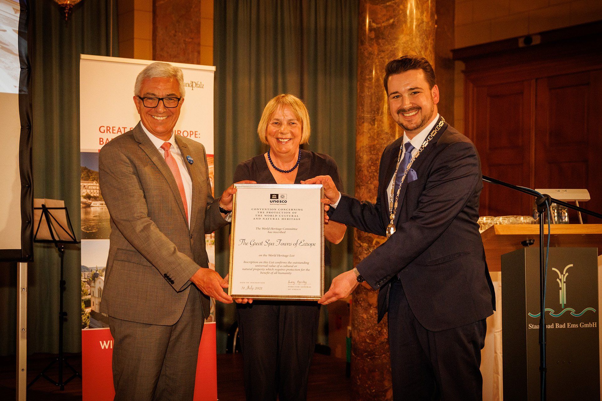 Dr. Birgitta Ringbeck von der Koordinierungsstelle des Auswärtigen Amtes überreichte dem rheinland-pfälzischen Innminister, Roger Lewentz und dem Stadtbürgermeister von Bad Ems, Oliver Krügel, die Urkunde zur Anerkennung des UNESCO-Welterbes.